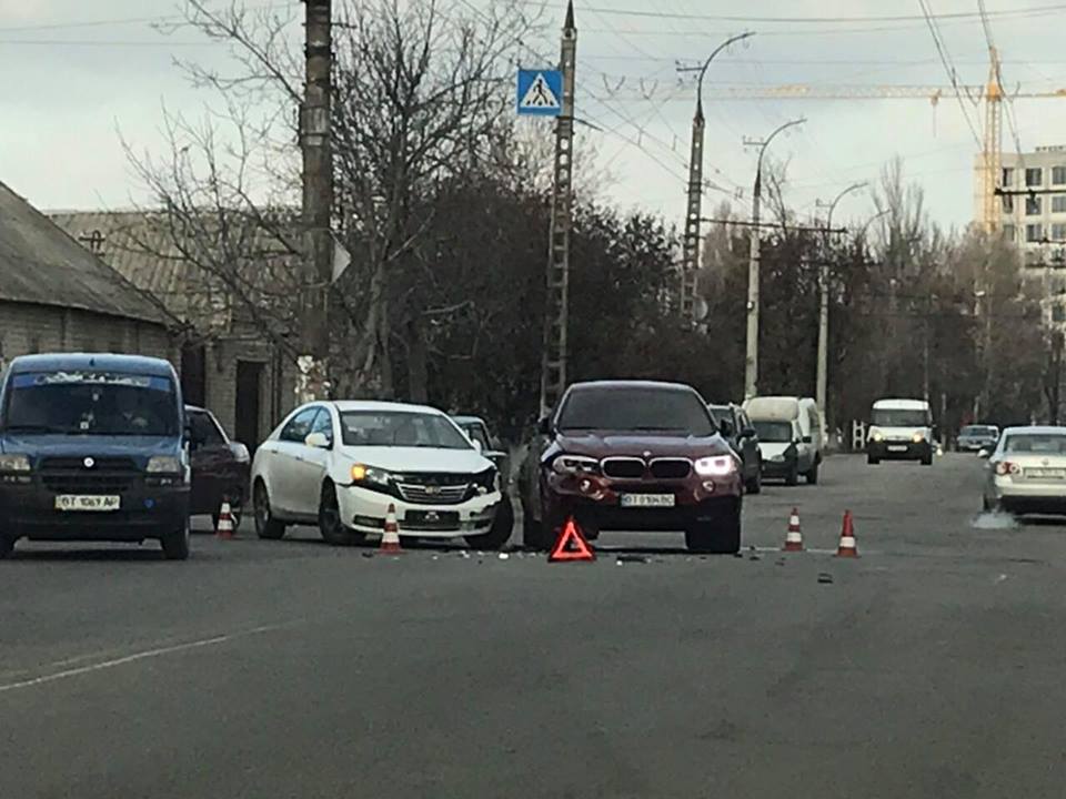 В этот раз не разминулись бордовый БМВ и белый Джили...