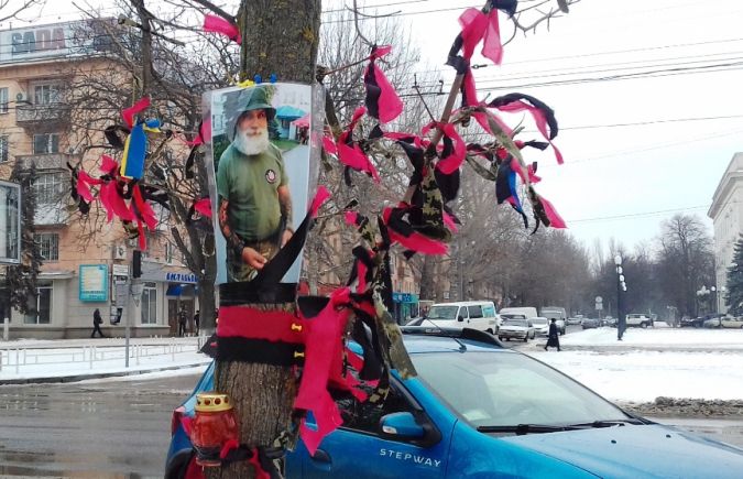 Но он не ушел из памяти херсонских собратьев, но не с Площади Свободы в центре Херсона, где проводил столько времени. Деревья напротив палатки теперь украшают его фото и ленты - синежолтые и чернокрасные.