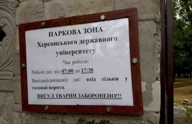 На одном из входов в парк ХГУ в Херсоне мы обнаружили объявление, что он открыт лишь с 7:00 до 17:30.