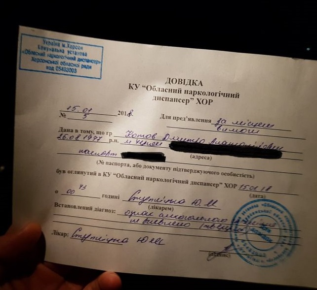 Константин Шульга опубликовал фото справки из наркопсихдиспансера, полученную водителем (в ней мы закрасили адрес и номер паспорта, - ред.)