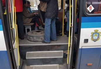 Херсонец Юрий опубликовал в соцсети фото маршрутного автобуса, у которого прямо посреди салона лежит ржавое колесо. Оно удобно расположилось напротив двери, и «ждет» пассажиров. И первый невнимательный херсонец об него, естественно, споткнется.