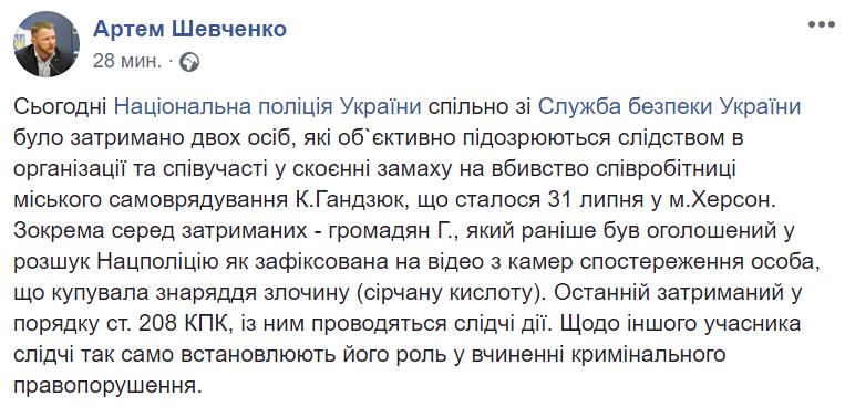Сегодня Национальная полиция Украина совместно с Службой безопасности Украины задержали двух человек, которые объективно подозреваются следствием в организации и соучастии в совершении покушения на убийство сотрудницы городского самоуправления К. Гандзюк, что произошло 31 июня в Херсоне.