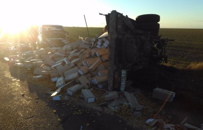 На трассе Мелитополь-Одесса (М14) неподалеку от села Братское Нижнесерогозского района произошло ДТП с участием грузовика, доверху набитого печеньем.