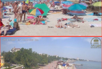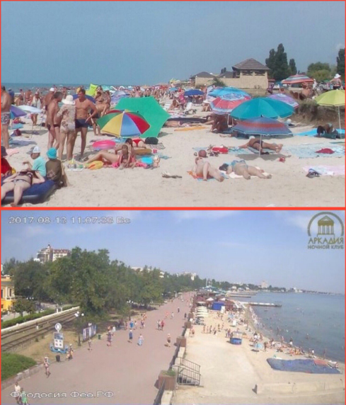 В социальной сети для сравнения опубликовали две совмещенные фотографии, на которых видно, сколько отдыхающих украинцев в поселке Приморское Херсонской области и в Феодосии россиян.