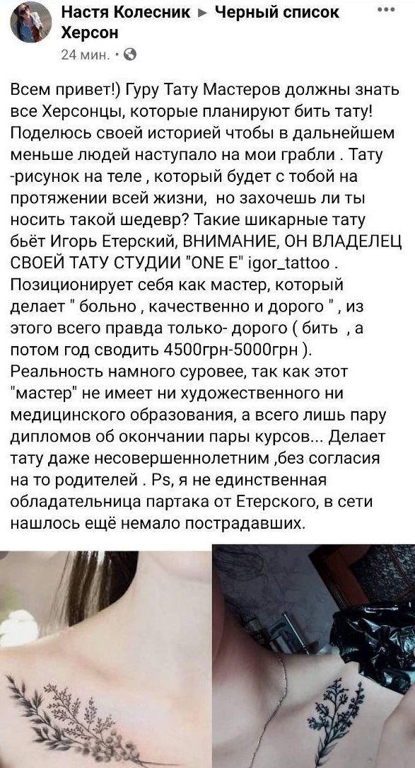 Херсонка Анастасия Колесник на своем примере показала, как иногда не совпадают "ожидание и реальность" при заказе услуг в нашем городе. Девушка рассказала, что обратилась за услугой к тату-мастеру, показала пример рисунка, который бы хотела нанести на ключицу. Пройдя сквозь неприятные ощущения и потратив на "шедевр" почти 5 тысяч гривен девушка, как она выразилась, получила не изящное тату, а обыкновенный "партак" (испорченное, непрофессиональное тату - прим.ред.).