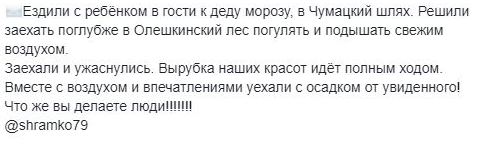 «Решили заехать поглубже в Олешкинский лес, погулять и подышать свежим воздухом. Заехали и ужаснулись. Вырубка наших красот идёт полным ходом.