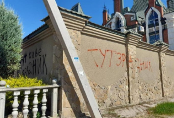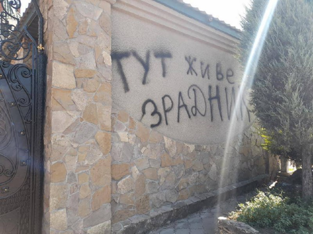Участники акции на заборе дома Мухригина написали "Здесь живет предатель".