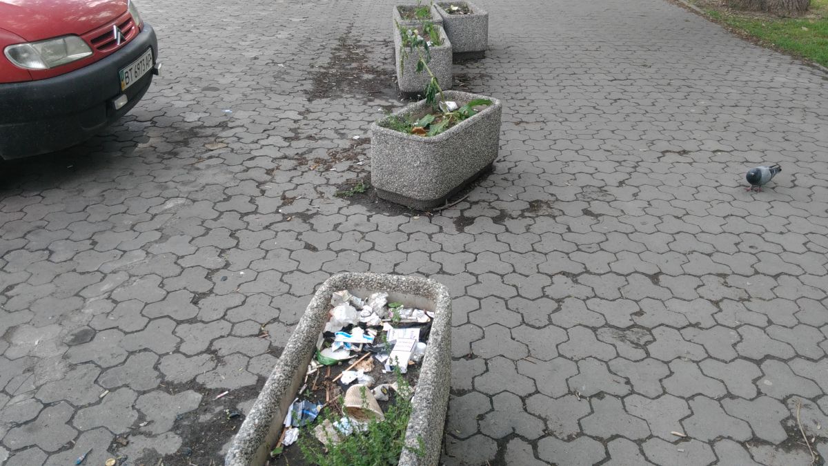 Речь шла об установленных перед зданием на Ушакова, 50 "конструкциях", предназначенных для высадки цветов". Вот только с цветами никак не складывается - как и в ноябре 2018 года, так и сегодня брошенные в хаотичном порядке они используются в качестве мусорок и еще в них с удовольствием произрастают сорняки.