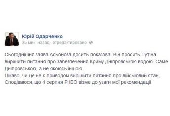Губернатор Херсонской областной государственной администрации Юрий Одарченко считает обращение премьера Крыма Сергея Аксенова к президенту России Владимиру Путину с просьбой обеспечить Крым днепровской водой поводом для введения в Украине военного положения.