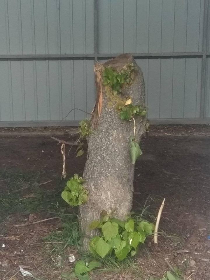 Прошу обратить внимание на очередную незаконную вырубку больших деревьев липы, которых и так не много в районе Таврического, ради чьей-то выгоды. Они готовились заранее. По подлости человеческой ночью сломали их, а потом, когда деревья легли на тротуарную дорожку и зелёную зону, их пришлось спилить - так как они мешали проходу. И в конце концов, теперь ещё на живых деревьях ставят ларек.