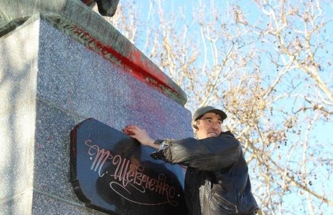 Неизвестные облили красной краской памятник Тарасу Шевченко и нарисовали свастику. Деревья вокруг памятника были обвешены флажками и трехцветными российскими лентами. К вечеру херсонцы самоорганизовались и очистили памятник от краски.