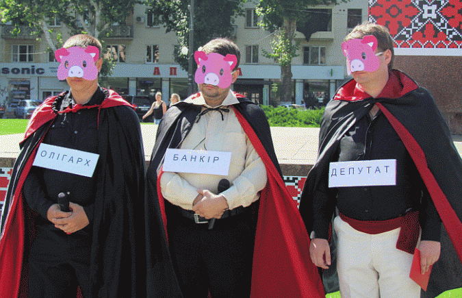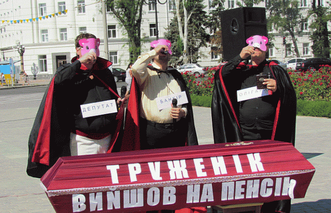 Похороны "человека, который оформил пенсию и через два дня умер" (как это отметили участники акции) проходили при стечении большого количества херсонцев. Пенсионера отпевали "три толстяка": депутат, банкир и олигарх, которые, выпив за упокой души не сумевшего прожить на крохи, называемые пенсией, сразу же переключились на кордебалет.