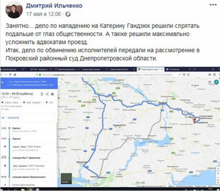 "Дело по нападению на Екатерину Гандзюк решили спрятать подальше от глаз общественности. А также решили максимально усложнить адвокатам проезд", - написал Ильченко.