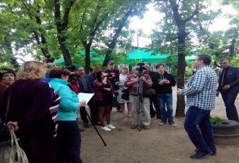 Херсонцы во главе с председателем городской общественной совета Александром Мошнягул собрались в парке "Дубки", вблизи междугородного автовокзала, посмотреть на состояние зеленой зоны и на место, где планируется строительство.